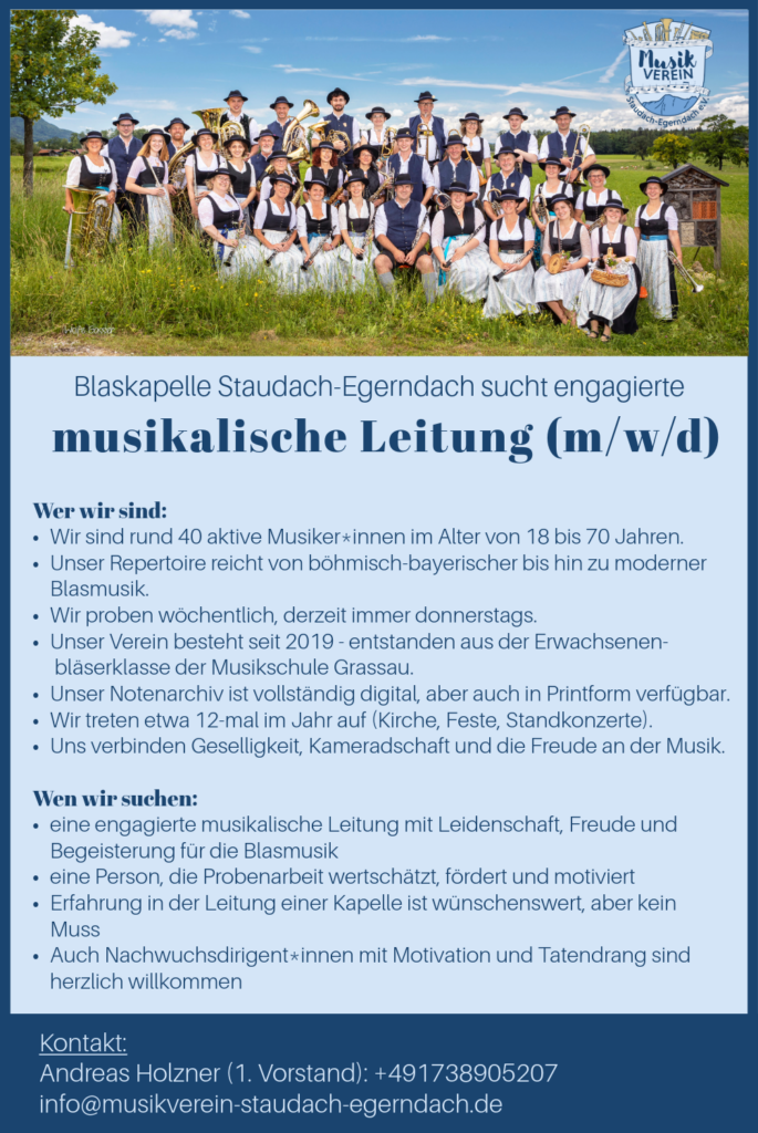 Leider verlässt unser Dirigent Lothar Beyschlag uns zum September 2026, da die Gemeinde Staudach-Egerndach aus dem Musikschulverbund ausgetreten ist. Wir suchen dringend einen neuen Dirigenten zum September 2026!